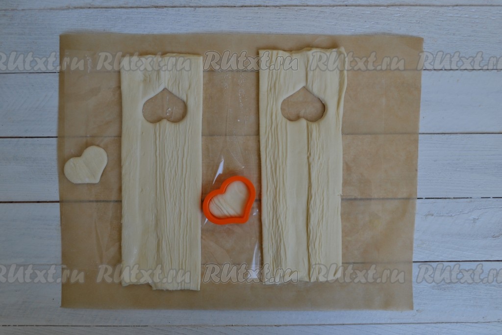 С одной стороны теста вырезать формочкой для печенья (форму формочки выбирайте по своему вкусу) отверстия, не доходя до края, примерно, 2 см.