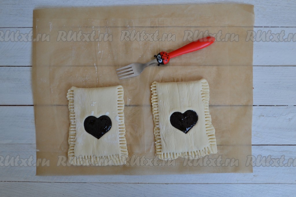 Накрыть повидло краем теста с отверстием. Аккуратно защипать края. Можно воспользоваться вилкой, с её помощью края будут надежно соединены и еще получится красивый, ребристый узор. Выложить заготовки в форму (у меня керамическая). Форму можно смазать растительным маслом или застелить пекарской бумагой.