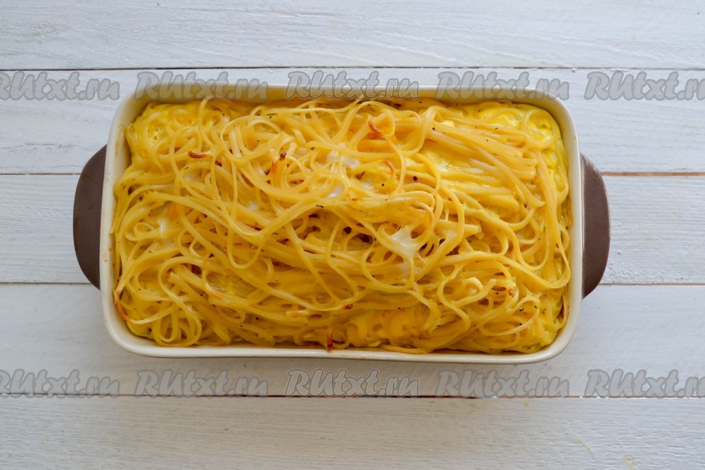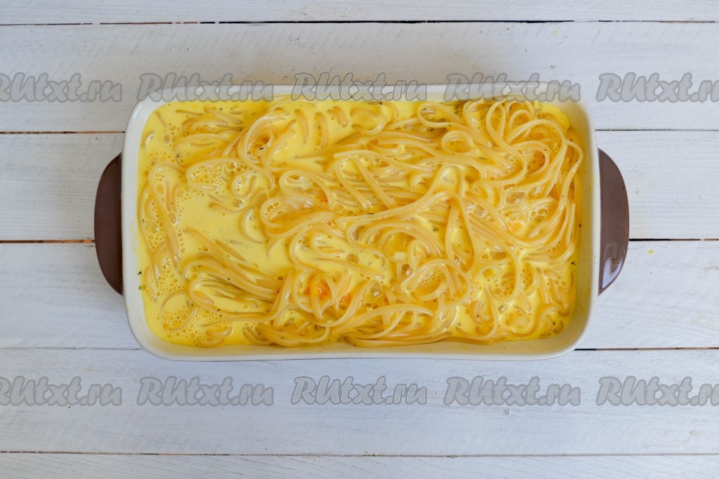 Макаронные изделия залить смесью яиц и сливок, сразу же отправить лапшевник из макарон в разогретую духовку.