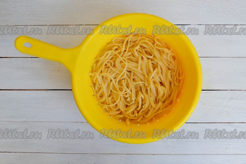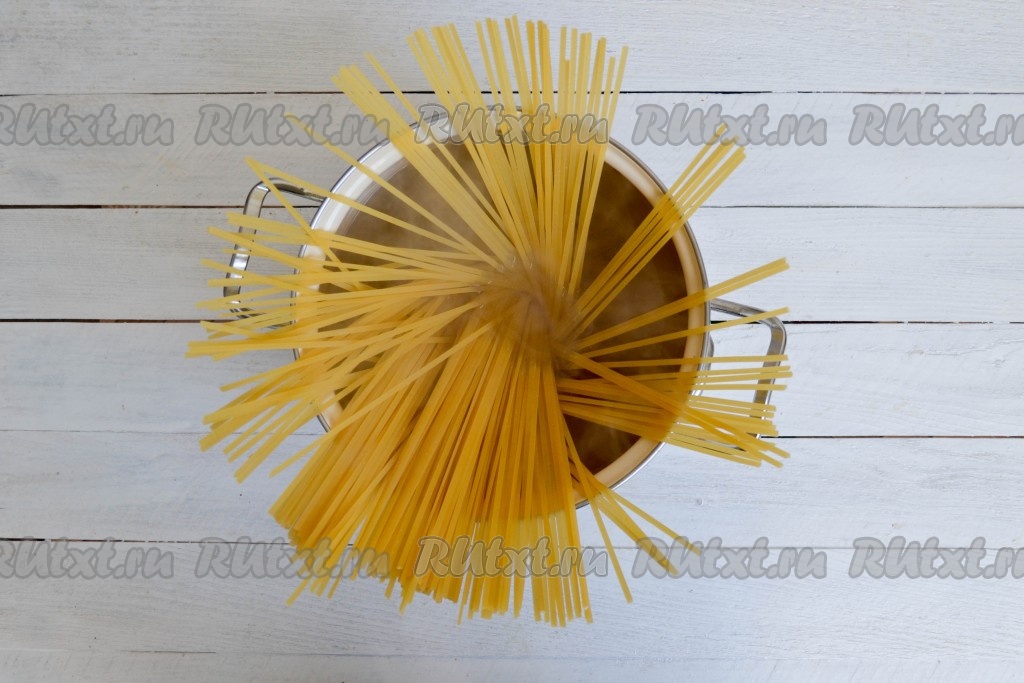 Необходимо отварить макаронные изделия в соответствии с указаниями на упаковке. Главное - не переварить, макароны должны остаться внутри немного твердыми (al dente).
