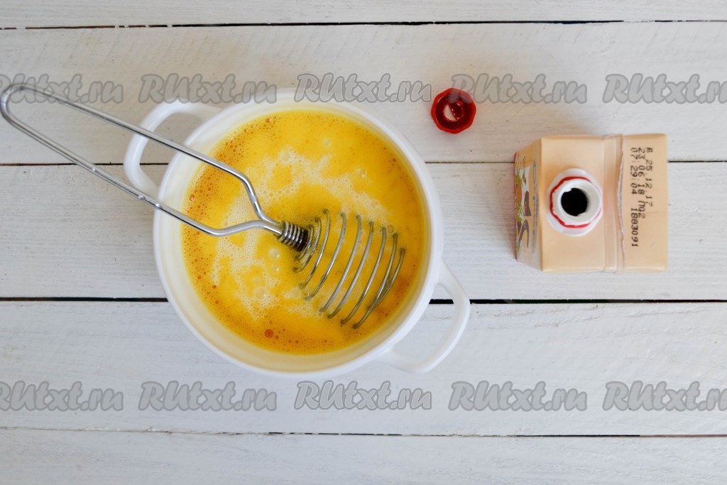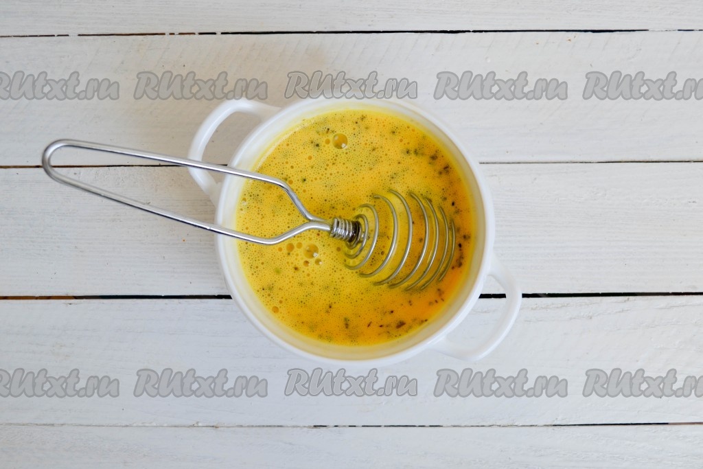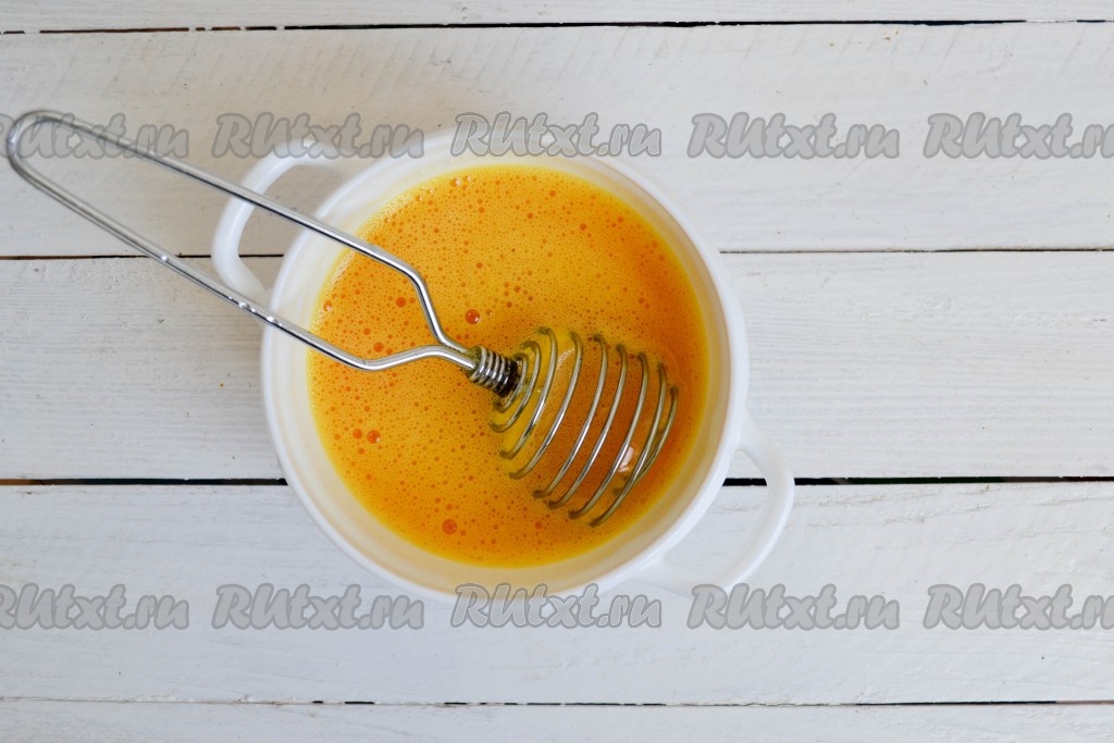 Куриные яйца выложить в глубокую миску и тщательно взбить венчиком или миксером.