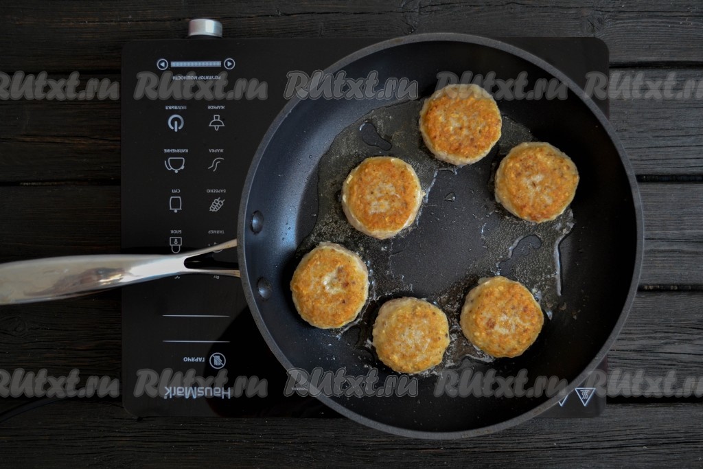 Обжарить котлетки на среднем огне до румяности (примерно, по 3-4 минуты) с каждой стороны.