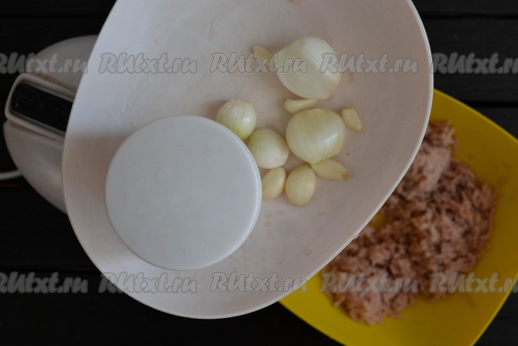 Очистить лук и чеснок, перемолоть и добавить к фаршу.