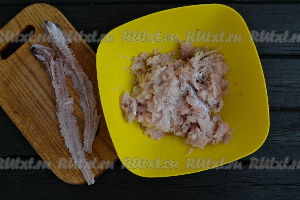 Размороженную рыбу вымыть, удалить внутренности и черную пленку из брюшка, снять кожу. Отделить мясо от костей.
