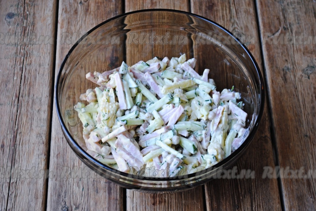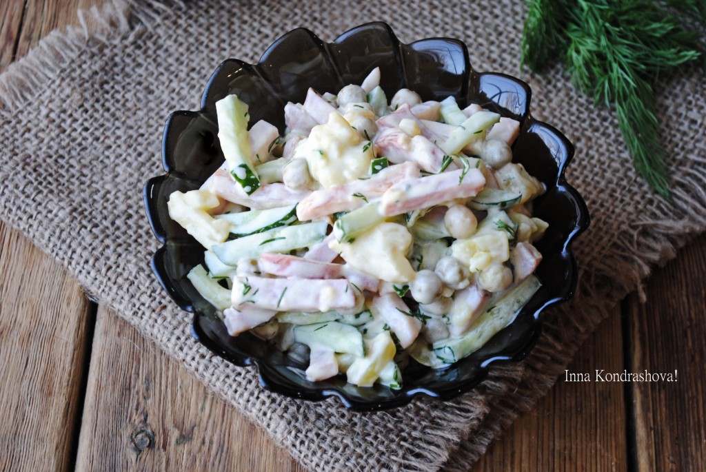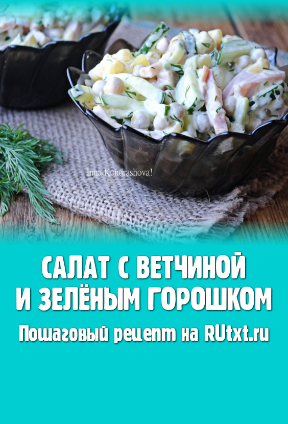 Вкусный, сытный салат "Влажский", приготовленный с ветчиной и зелёным горошком, разложить по салатницам и можно подавать на стол.