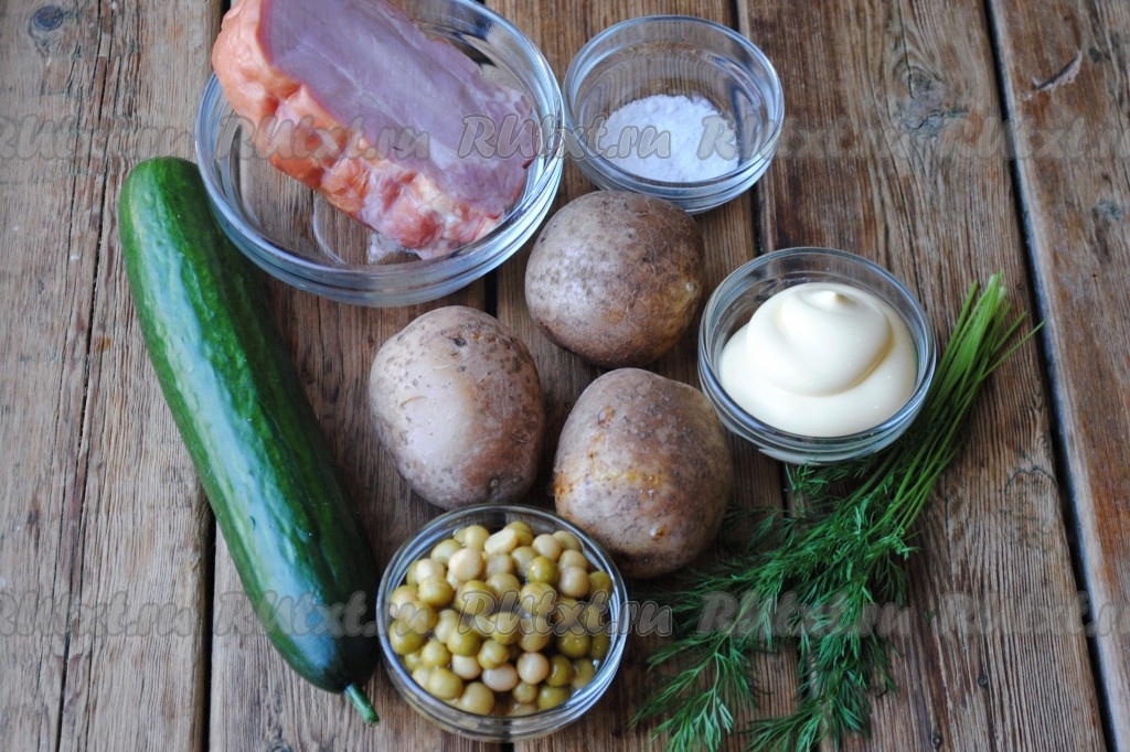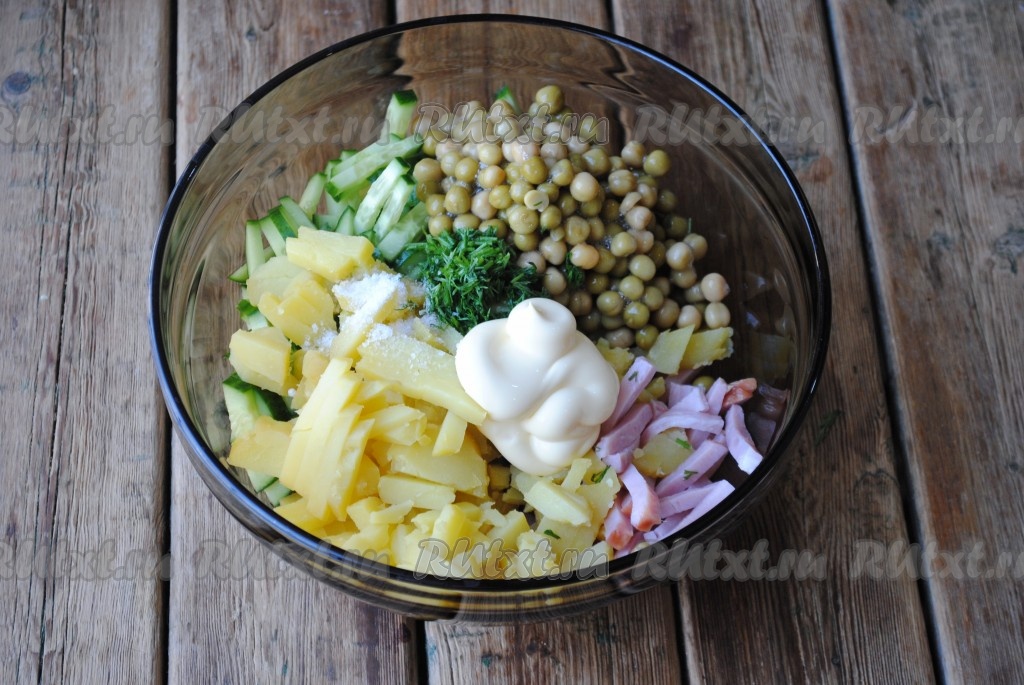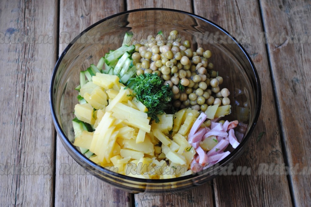 В большую миску сложить картофель, ветчину, огурцы и консервированный горошек. Укроп мелко нарезать и добавить в салат.