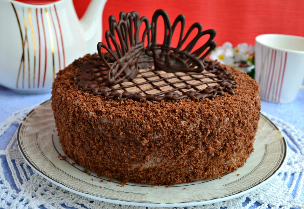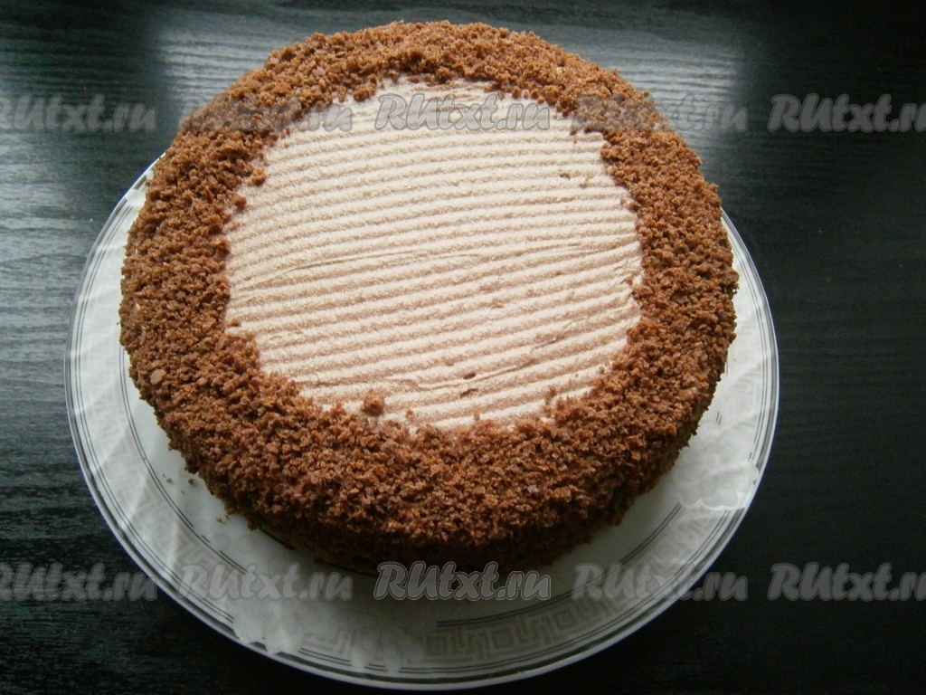 Отправить торт "Пражский" в холодильник на 1 час, после чего бока обсыпать крошкой, захватывая немного и верх торта (как на фото).