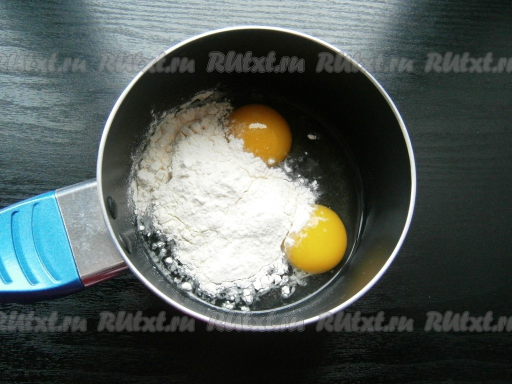 Для приготовления крема в ковшик разбить 2 яйца, добавить муку.