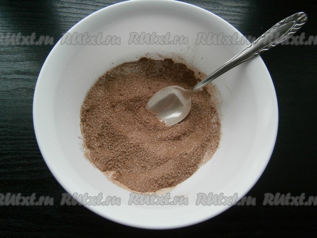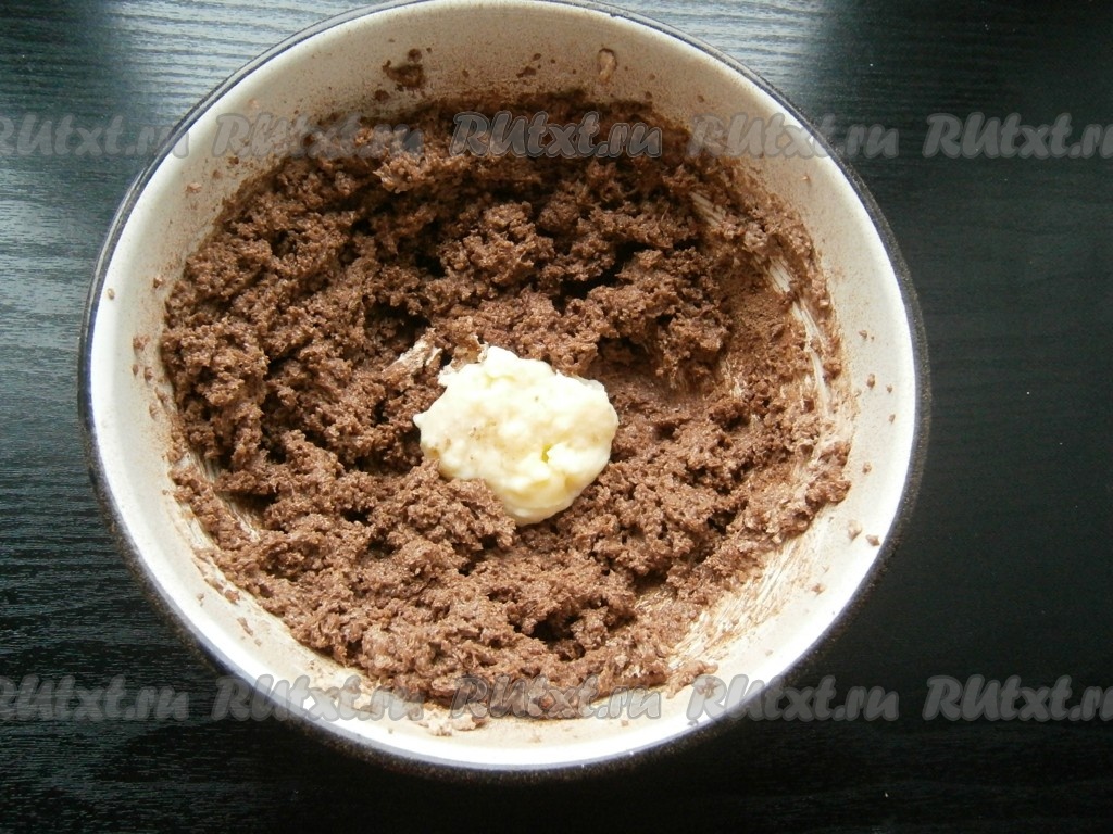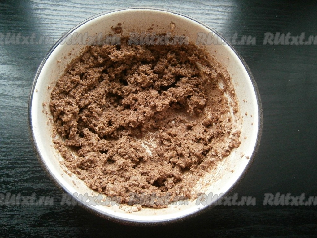 Размягченное сливочное масло взбить миксером, постепенно добавить сахар с какао-порошком, продолжая взбивать.