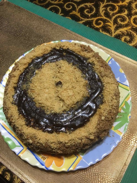Отправить торт "Пражский" в холодильник на 1 час, после чего бока обсыпать крошкой, захватывая немного и верх торта (как на фото).