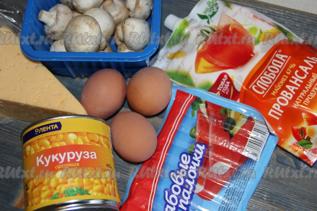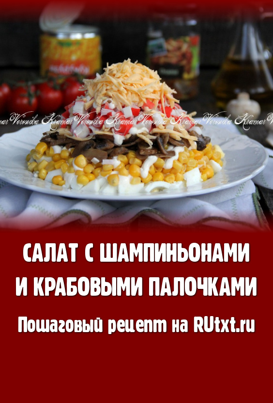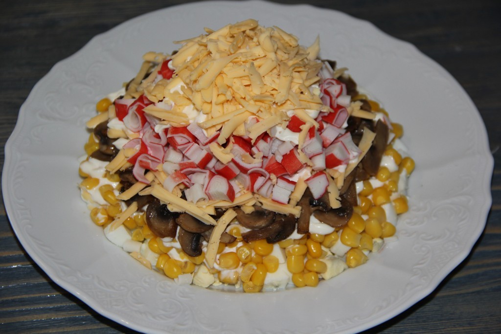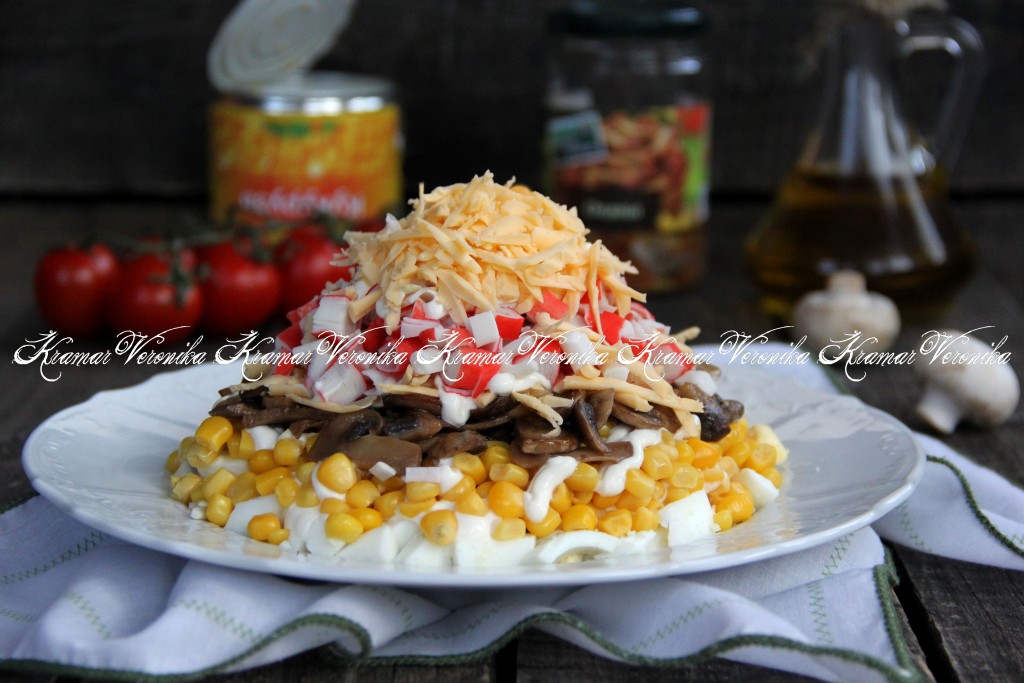 Хочу предложить рецепт красивого, вкусного и сытного салата с жареными шампиньонами и крабовыми палочками. Готовится он совсем несложно, а получается отличным. Оформить салат можно слоями в виде горки или выложить слоями в глубокую миску. Очень вкусно, попробуйте!