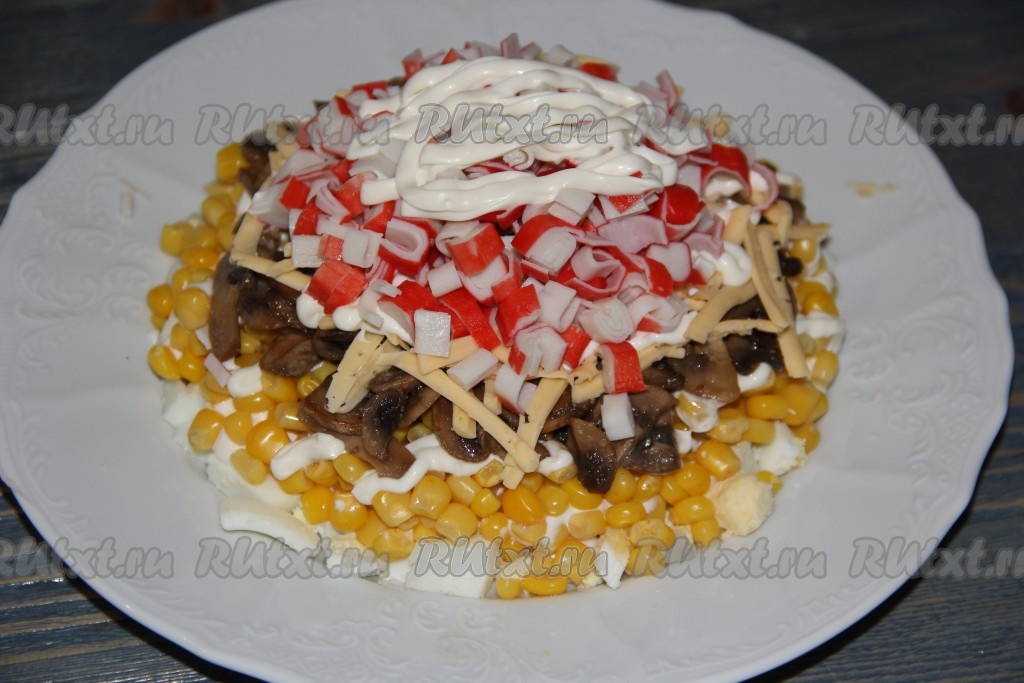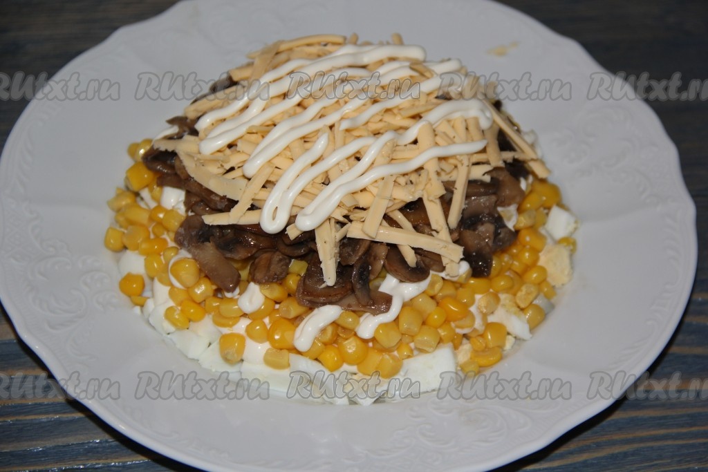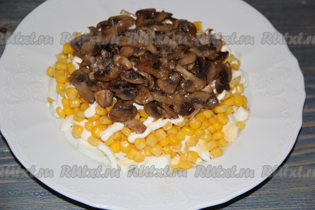 Грибы после жарки остудить. Затем на слой кукурузы выложить остывшие шампиньоны и слегка посолить.