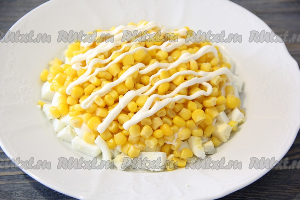 Яйца очистить, нарезать на средние кубики, выложить на плоскую тарелку и разровнять. Немного посолить и сделать тонкую решетку из майонеза. Кукурузу, слив лишнюю жидкость, выложить поверх яиц. Сделать решетку из майонеза.