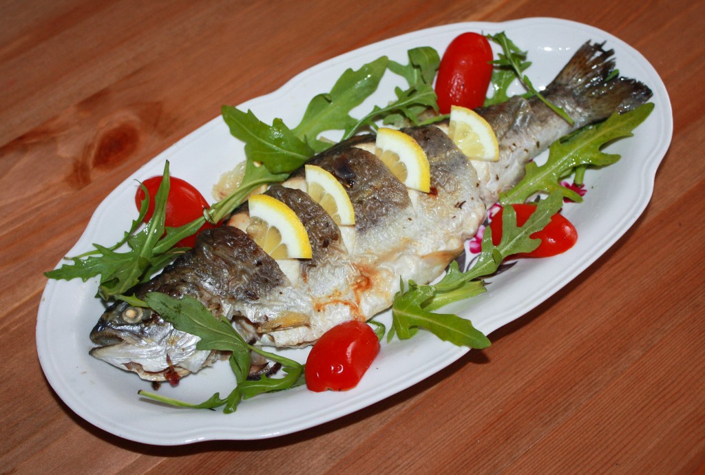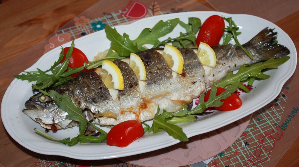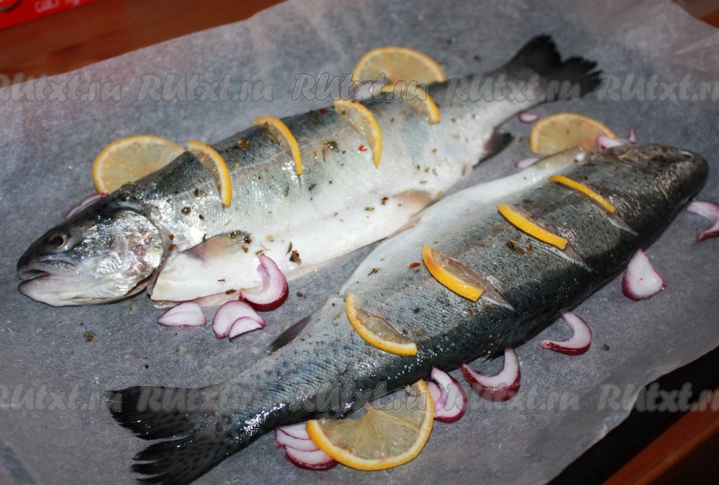 В оливковое масло добавить сок половинки лимона, специи, перемешать, выложить рыбу на противень, застеленный пергаментной бумагой или бумагой для выпечки. Обмазать рыбу со всех сторон смесью масла, лимонного сока и приправ. Сделать на поверхности рыбы несколько небольших надрезов ножом и вложить в них дольки лимона. Также, для вкуса и аромата, вокруг рыбы можно выложить лук, нарезанный полукольцами, и дольки лимона.