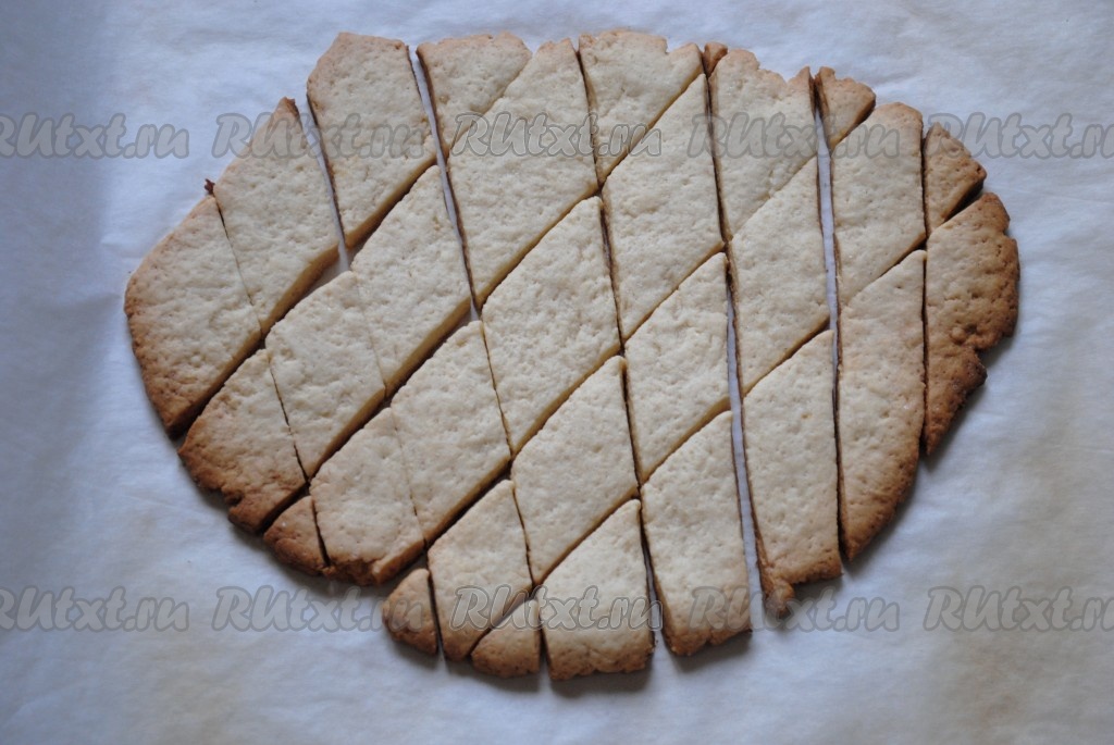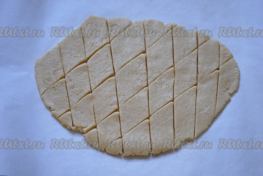 Выложить тесто на пергаментную бумагу и раскатать в пласт толщиной 0,5 см. Острым ножом разрезать на ромбы или квадраты, желаемых размеров.