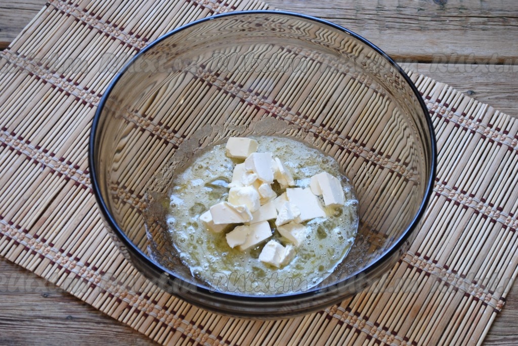 Охлаждённый маргарин натереть на тёрке или нарезать небольшими кубиками и добавить к яично-сахарной смеси.