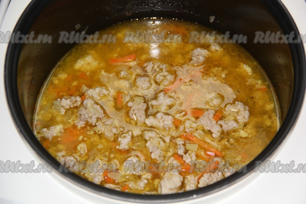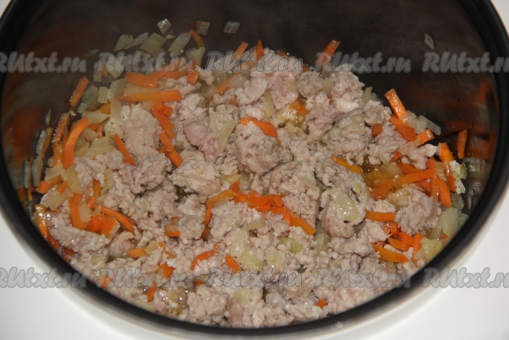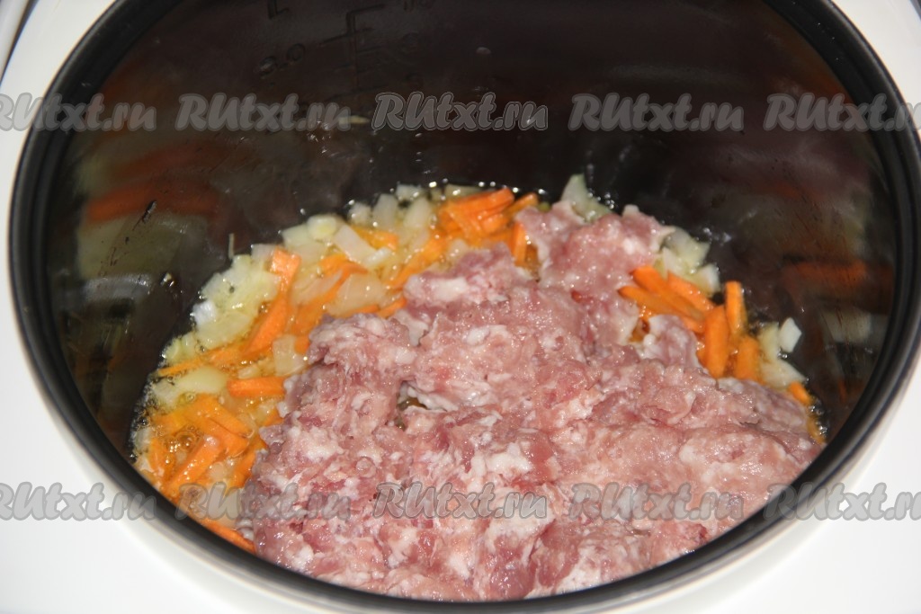 Затем добавить в чашу фарш и на режиме "Жарка" обжарить его с овощами в течение 5 минут.