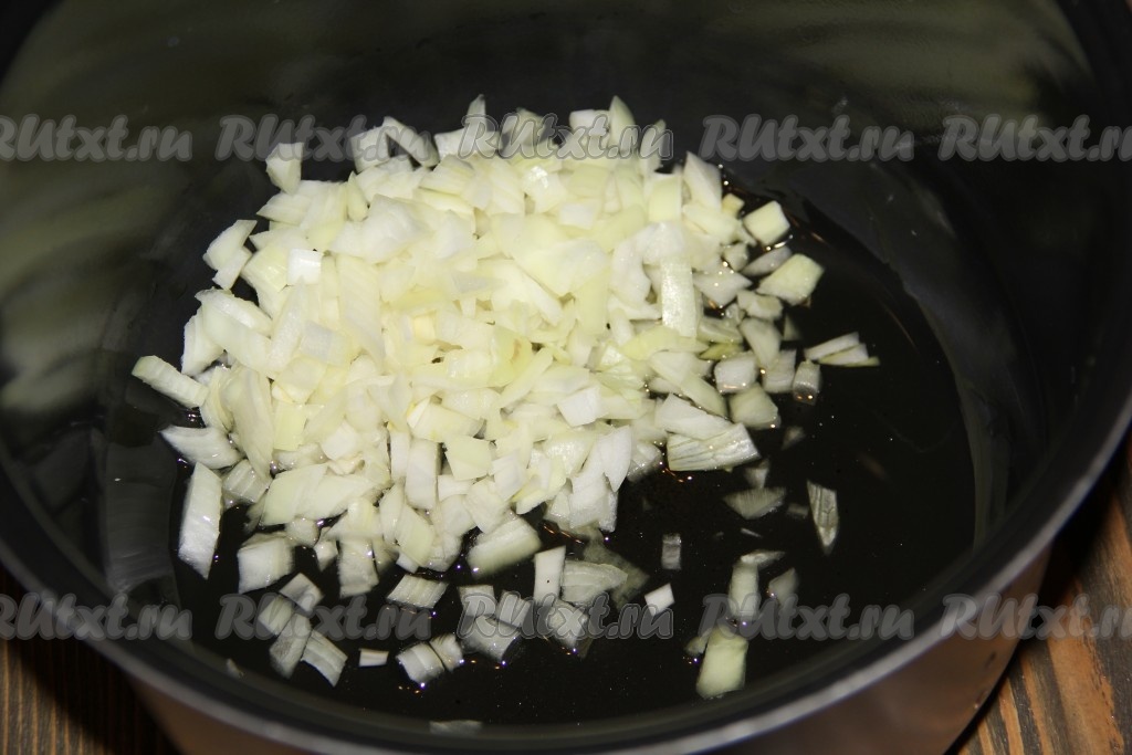 Лук очистить и мелко нарезать. В чашу мультиварки влить растительное масло и добавить лук. Включить режим "Жарка". Обжарить лук, помешивая, в течение 5 минут.