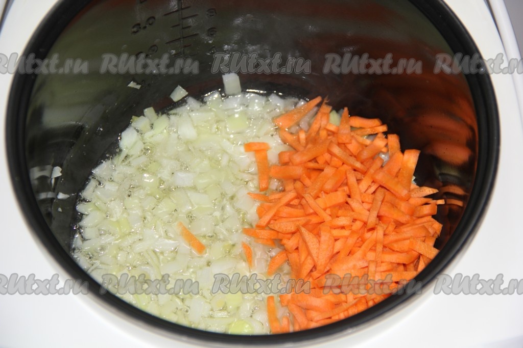 Морковь очистить и натереть на крупной тёрке или нарезать на брусочки. Добавить морковь в чашу и обжарить морковку с луком, помешивая, в течение 5 минут.