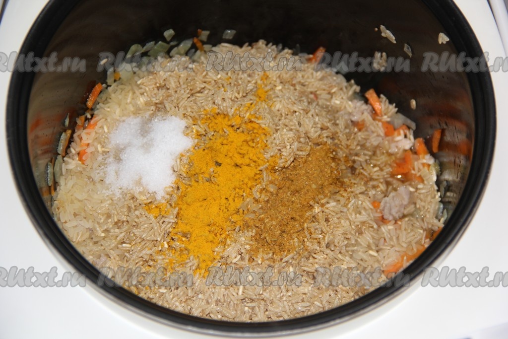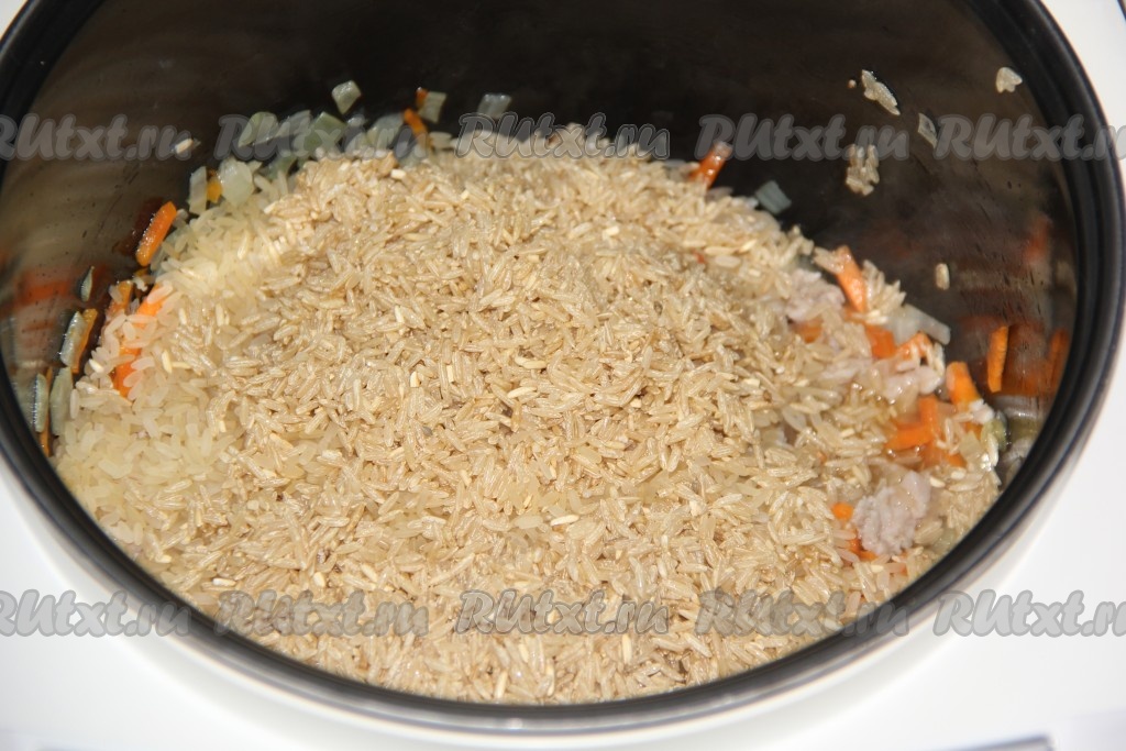 Затем влить воду и перемешать плов, крышку мультиварки закрыть. Выставить режим "Плов" на 30 минут.