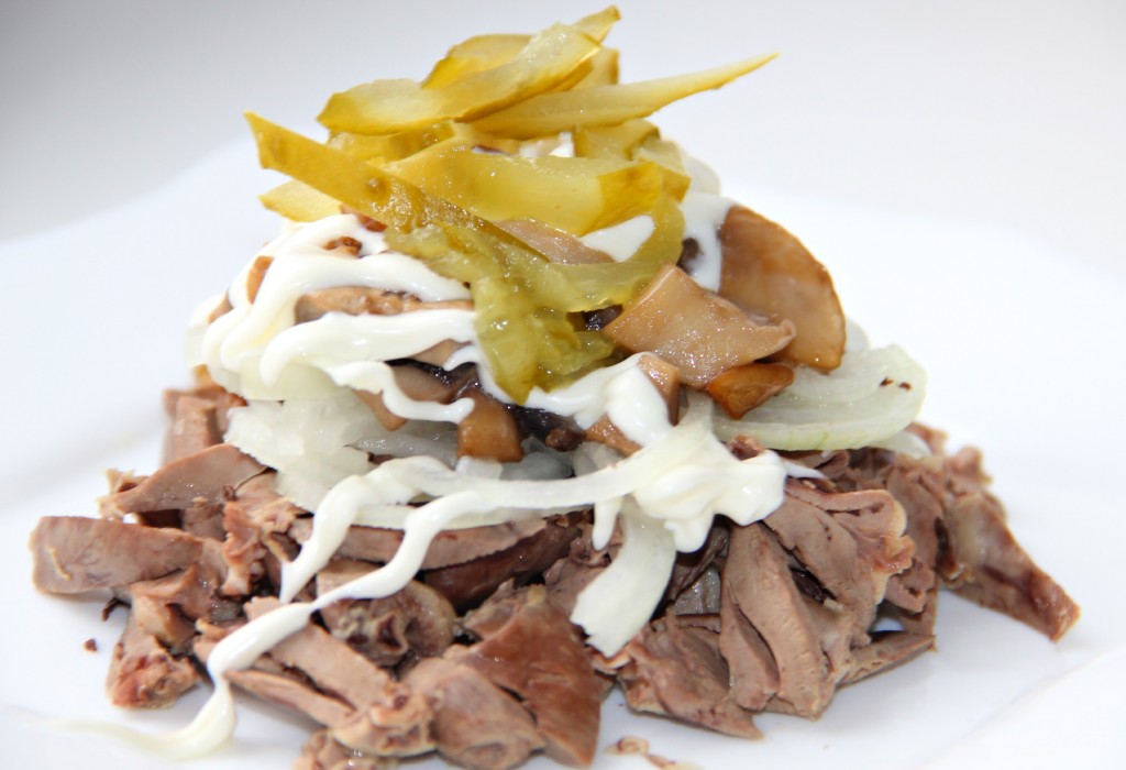 Смешиваем все ингредиенты нашего салата из куриных сердечек и шампиньонов и заправляем майонезом.