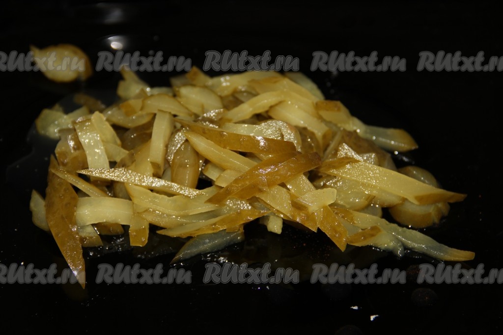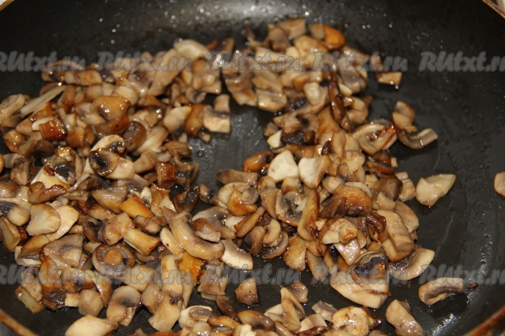 Шампиньоны крупно режем и обжариваем на растительном масле до готовности.