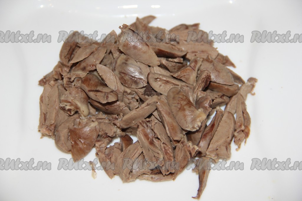 Куриные сердечки отвариваем до готовности. Нарезаем соломкой.