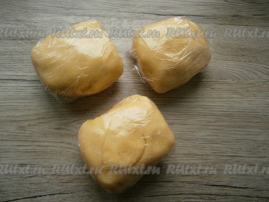 Разделить тесто на три равные части, каждую - завернуть в пищевую пленку и поместить в холодильник на 1 час.
