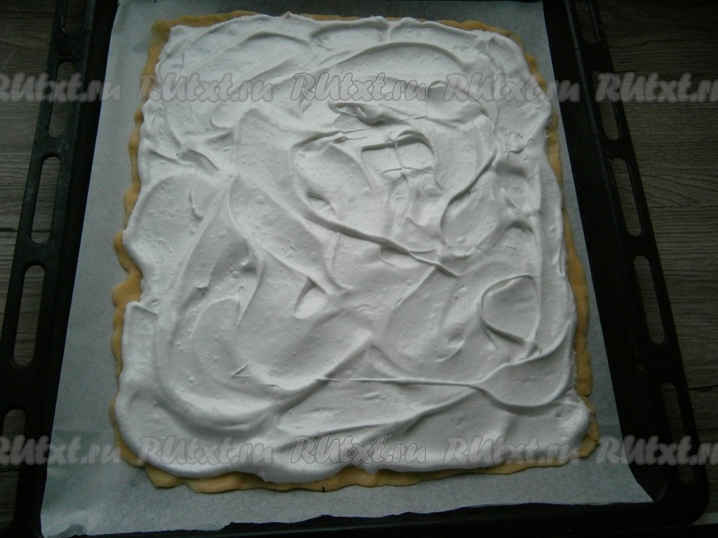 Поместить пергамент с тестом на противень. Поверх пласта теста размазать ложкой третью часть взбитой белковой массы.