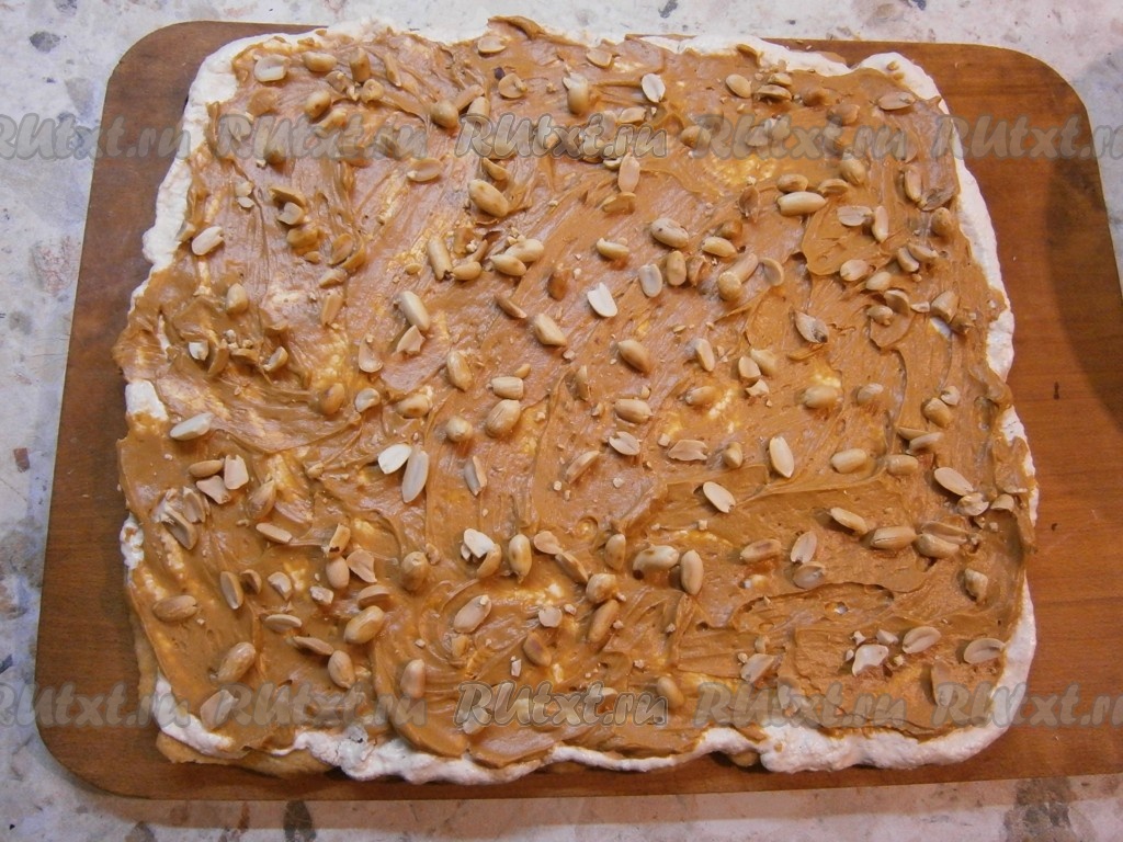 Далее коржи смазать кремом и посыпать сверху немного измельченным или целым арахисом.