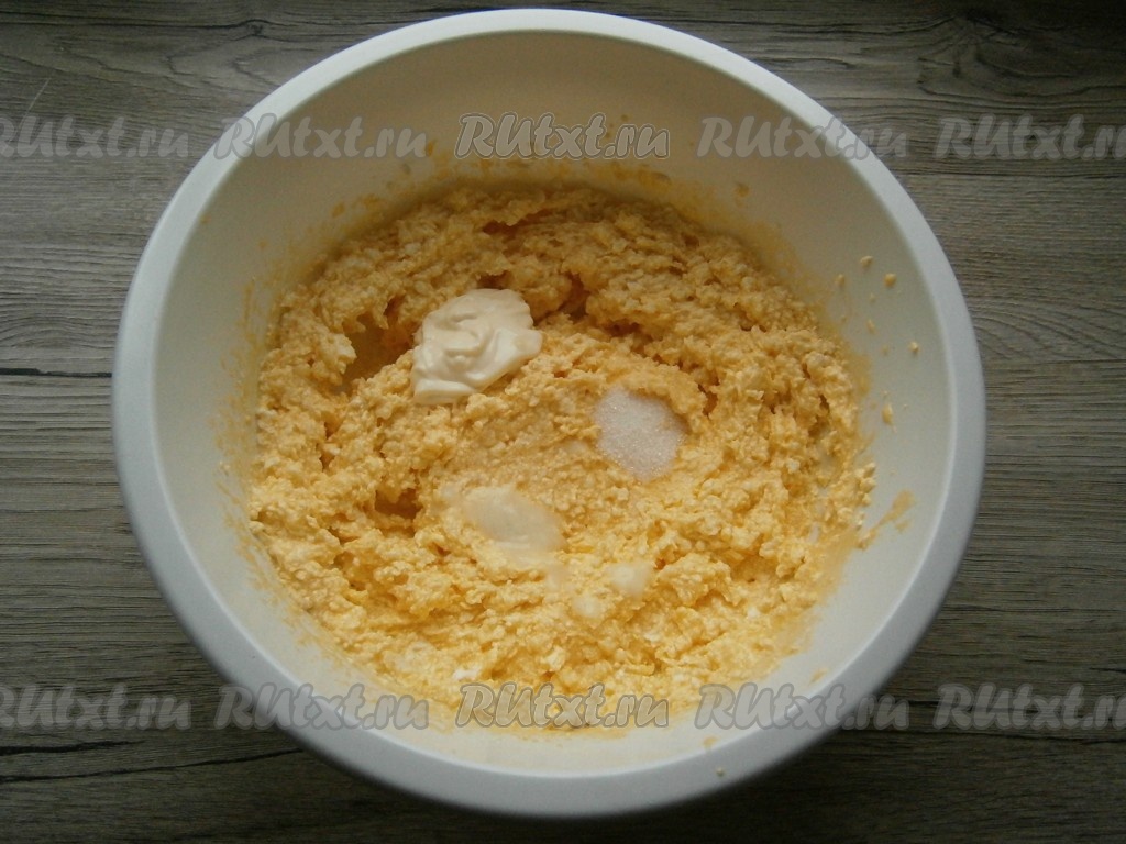 Желтково-масляную смесь взбить миксером, затем добавить ванильный сахар, майонез и соду, гашеную лимонным соком.