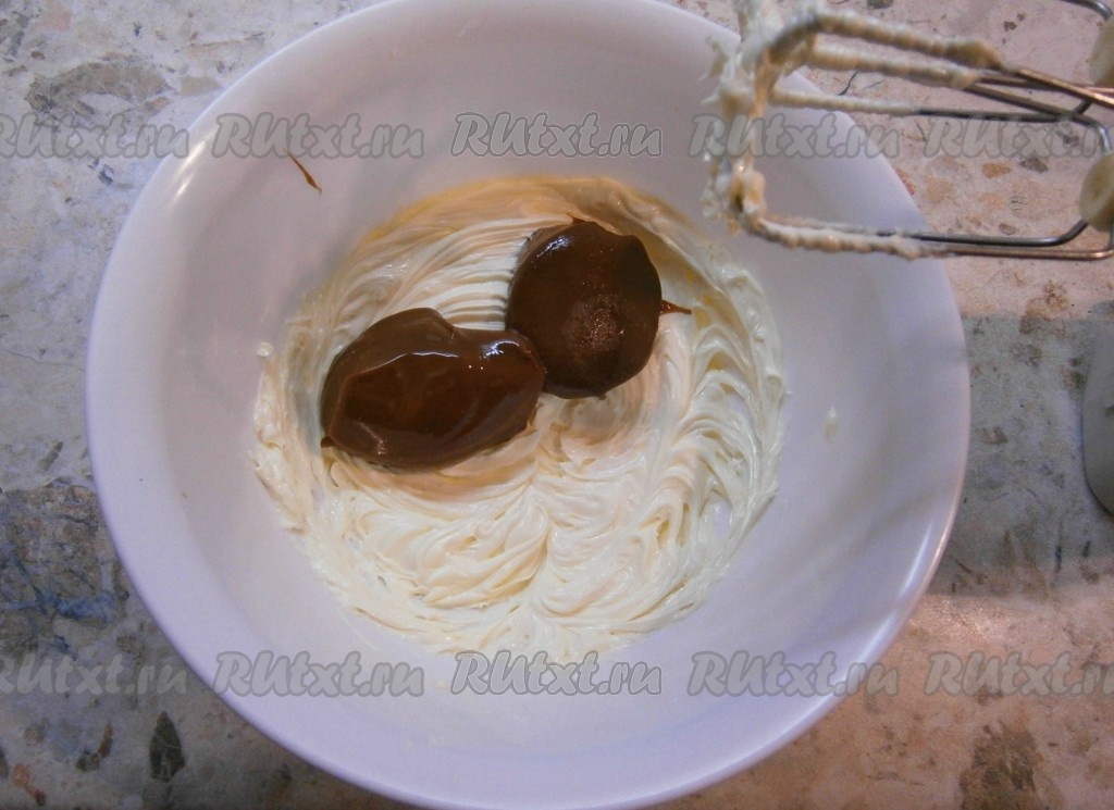 В готовый крем влить немного коньяка, еще раз взбить.