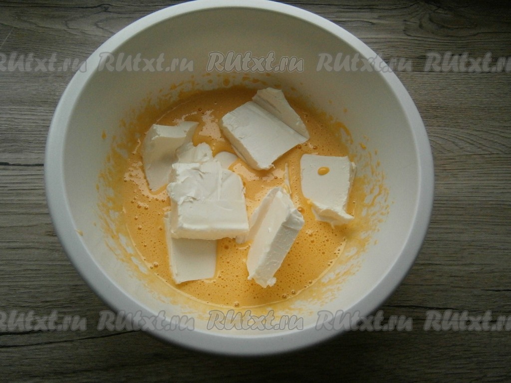 Взбить миксером и добавить размягченный маргарин (можете использовать сливочное масло).
