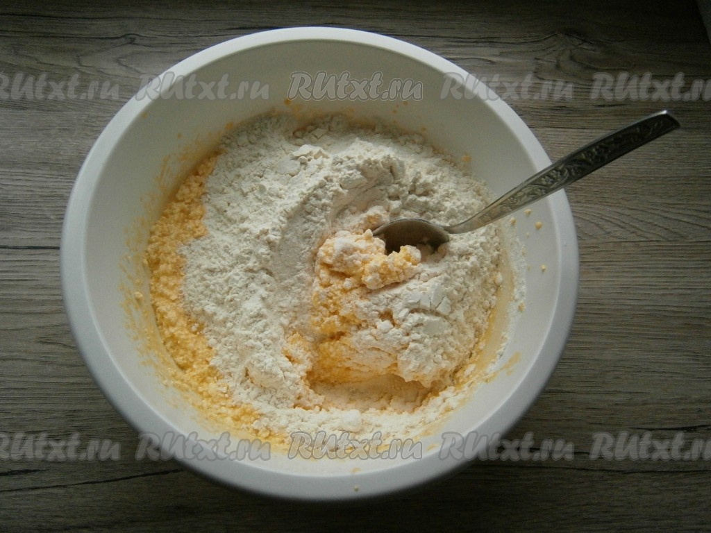 Хорошо перемешать и всыпать муку.