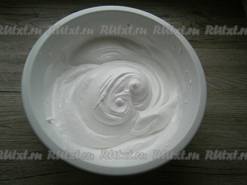 Для приготовления безе яичные белки взбить миксером до пышной пены со щепоткой соли, постепенно всыпать сахар, продолжая взбивать до устойчивых пиков.