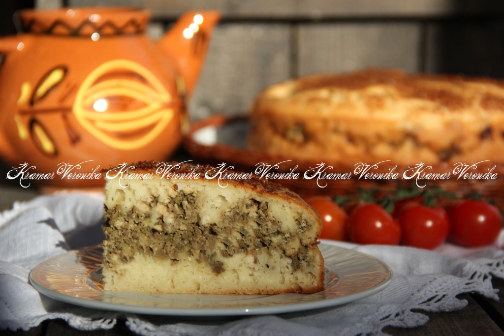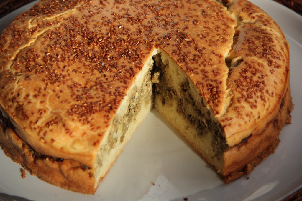 Выложить поверх начинки оставшееся тесто, посыпать кунжутом. Пирог отправить в разогретую духовку и выпекать, примерно, 50 минут при температуре 190 градусов. В процессе выпечки пирог покроется красивой золотистой корочкой.