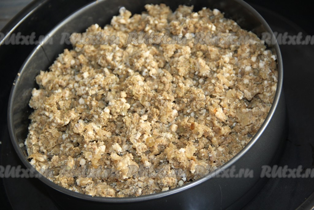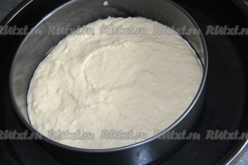 Разъёмную форму смазать сливочным маслом и выложить половину теста в форму.