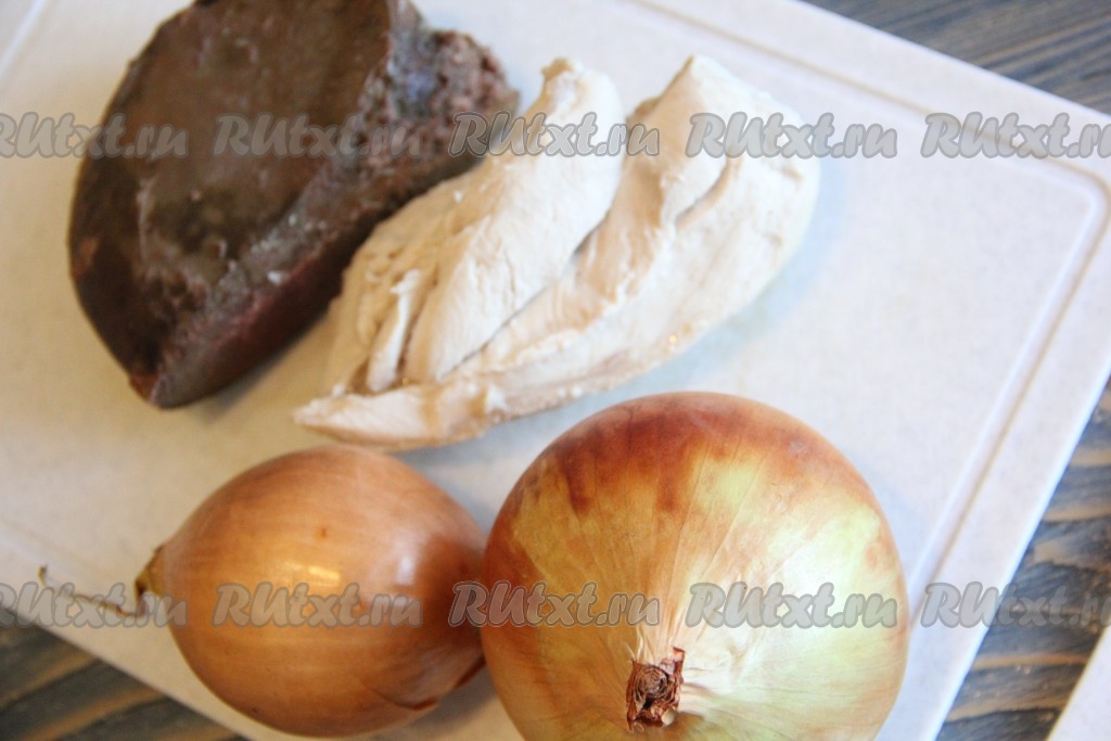 Печень, грудку и лук пропустить через мясорубку, посолить и поперчить по вкусу, хорошо перемешать начинку для заливного пирога.