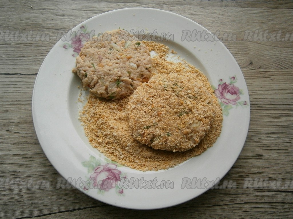 Мокрыми руками сформировать средней величины котлеты, обвалять их в сухарях.