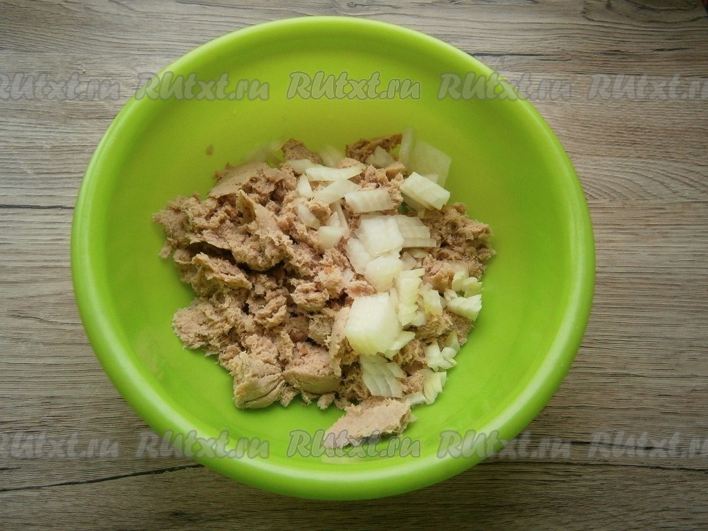 Если рыбный фарш заморожен, его нужно разморозить. К фаршу добавить мелко нарезанный очищенный лук.