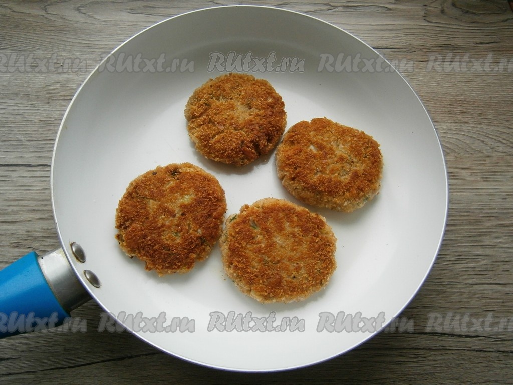 Жарить котлеты на разогретом растительном масле на среднем огне до румяного цвета с обеих сторон.