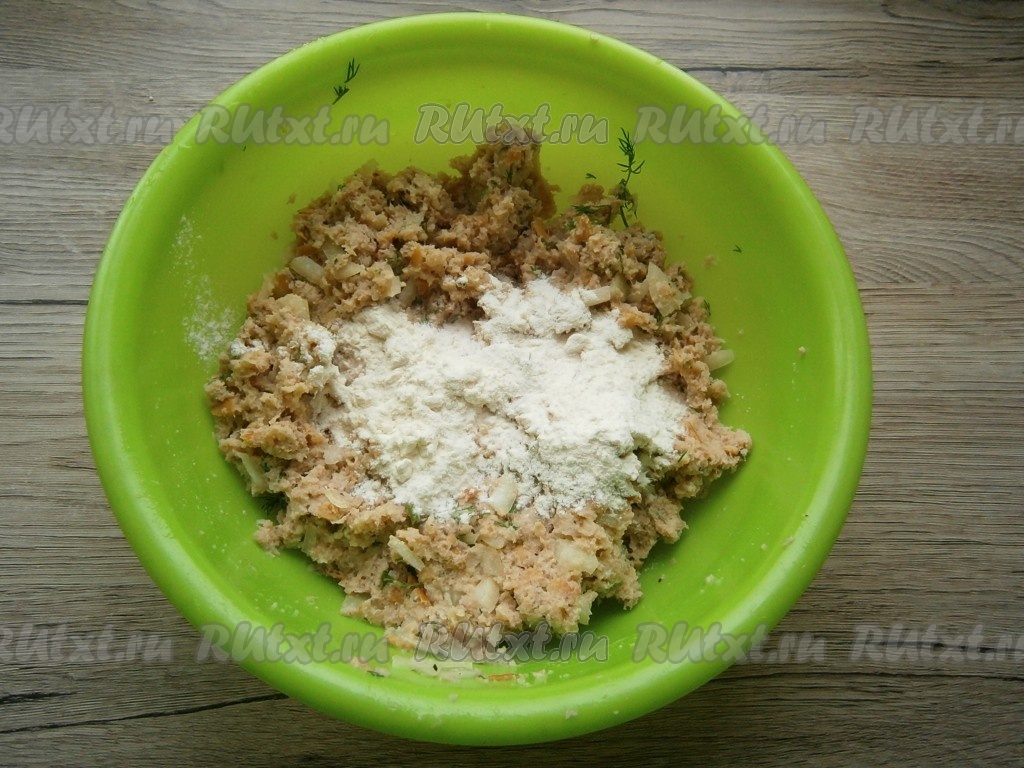 Фарш тщательно перемешать, всыпать немного муки, снова перемешать.