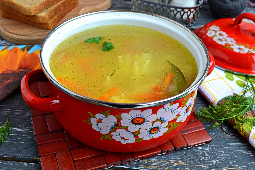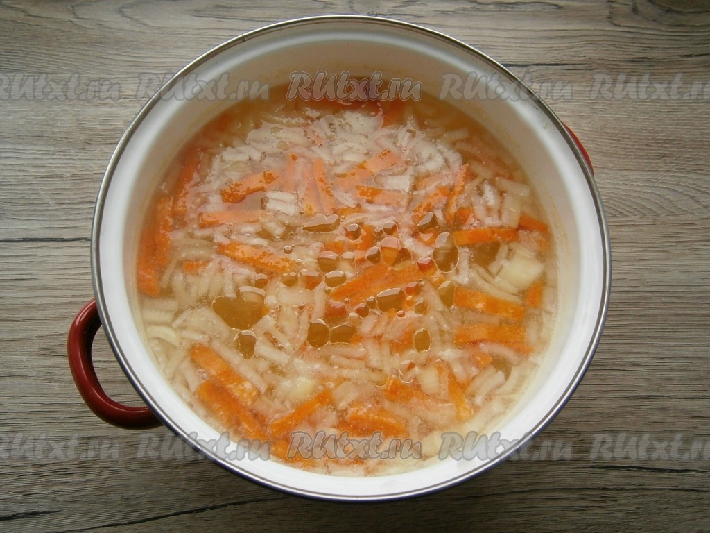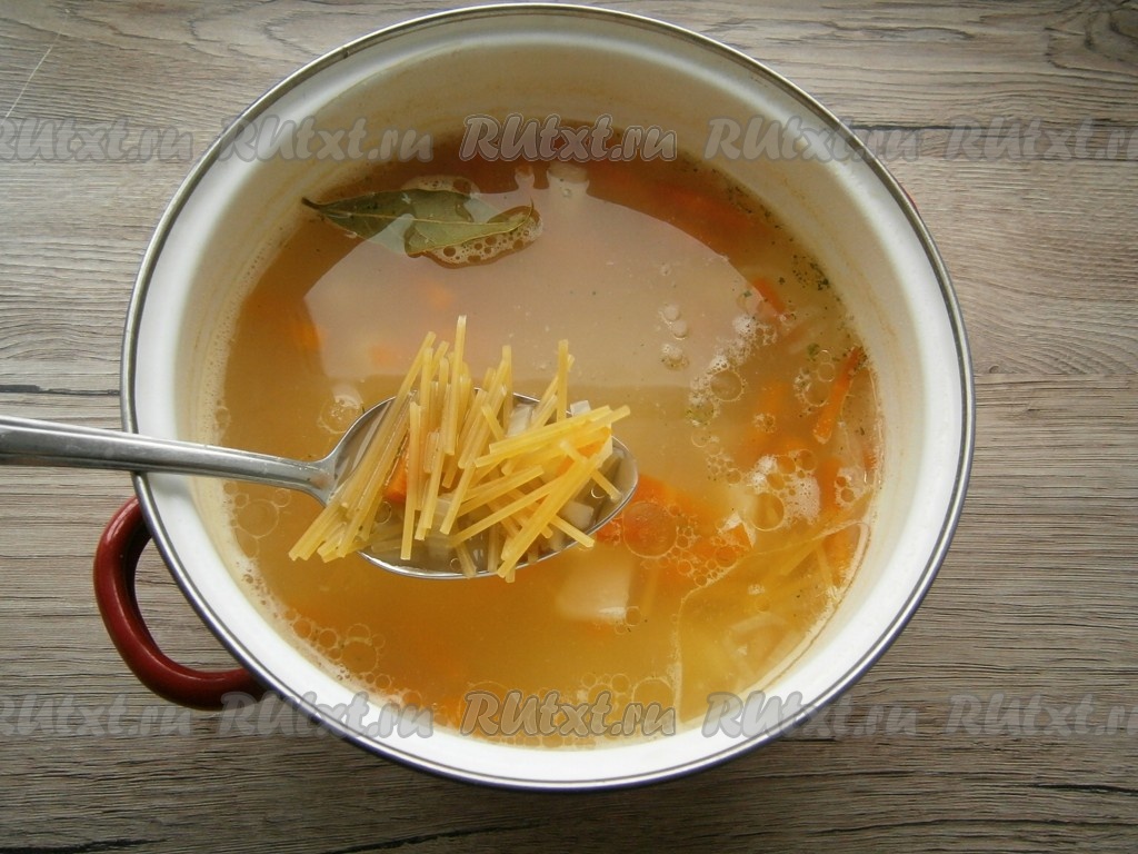 Варить постный суп на небольшом огне 30 минут, после чего добавить приправу, лавровый лист и вермишель. Вода немного выкипит, поэтому долить чуть горячей кипяченой воды и суп досолить по вкусу.