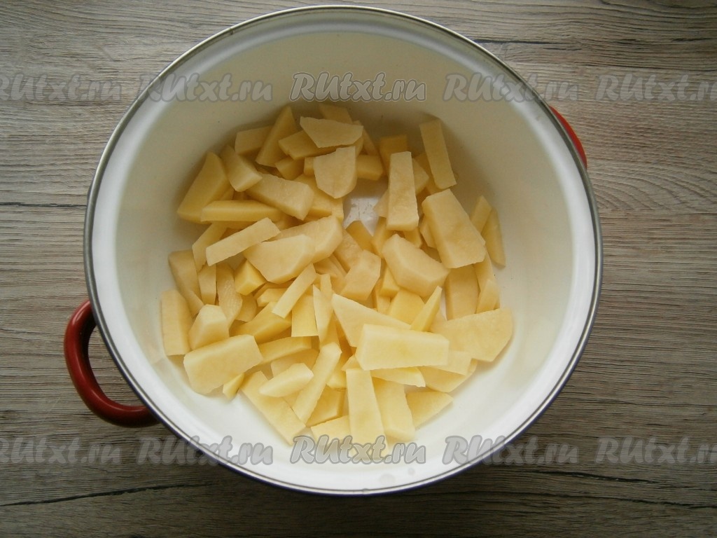 Лук, картофель и морковь очистить, вымыть. Картошку нарезать прямо в кастрюлю небольшими кусочками.