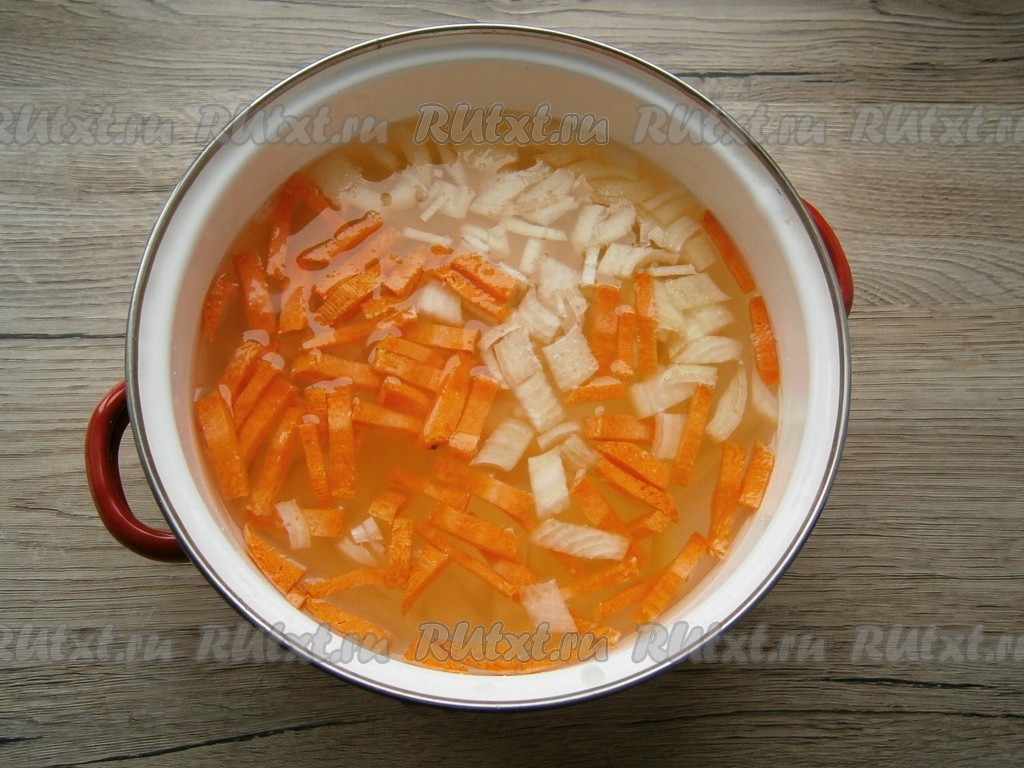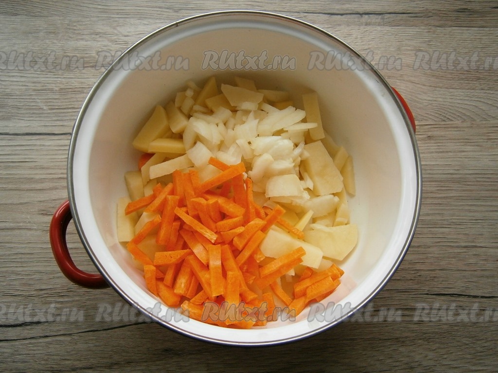 В кастрюлю с картошкой выложить мелко нарезанный репчатый лук и нарезанную соломкой или брусочками морковь.