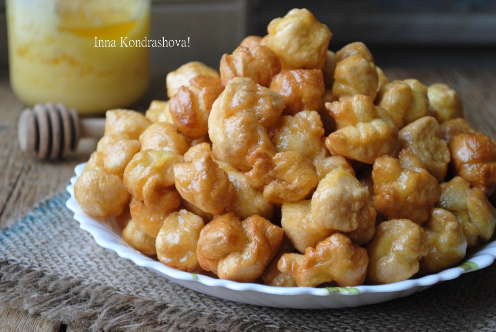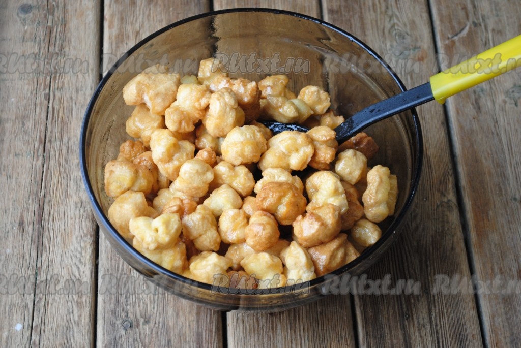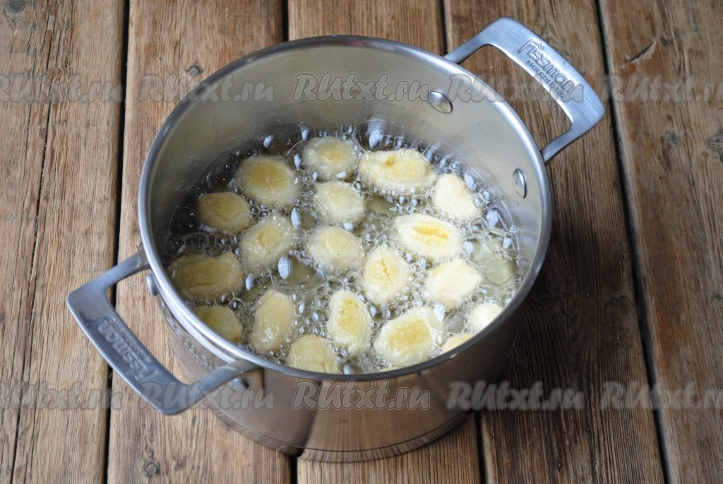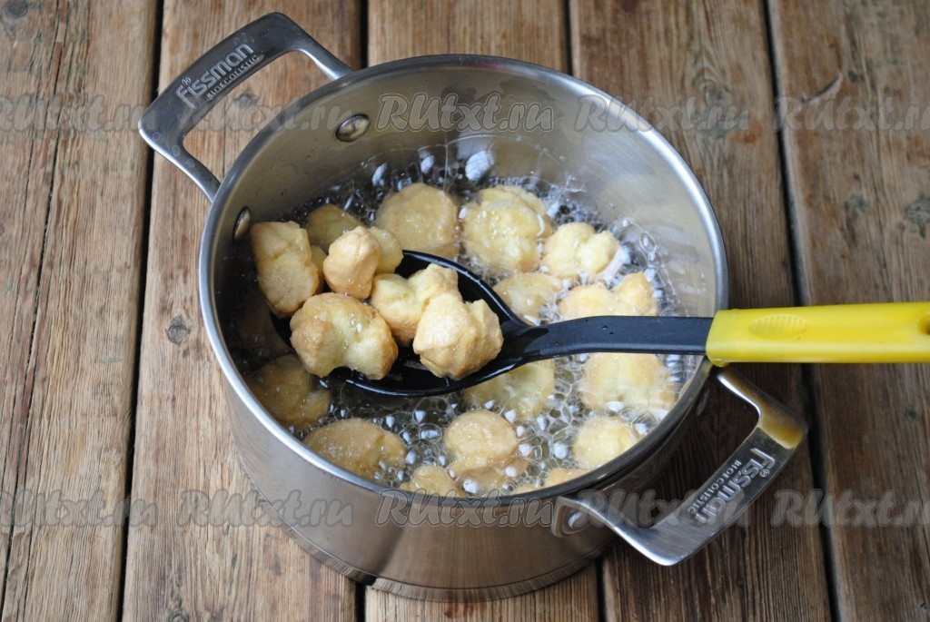 Растительное масло налить в небольшую кастрюлю (казан или сковороду) и хорошо разогреть. Масла должно быть много, чтобы кусочки теста в нём свободно плавали. Порциями отправить заготовки во фритюр и обжарить на среднем огне, помешивая, до золотистого цвета.