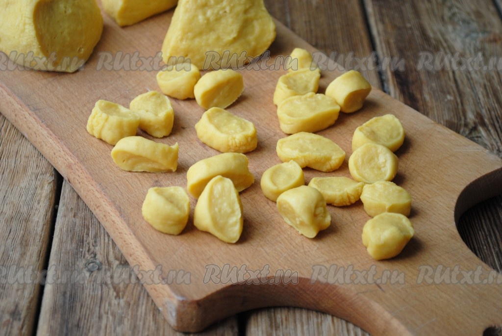 Каждую часть раскатать в жгут, примерно, 1,5 см в диаметре. Затем нарезать на небольшие кусочки (как на фото).