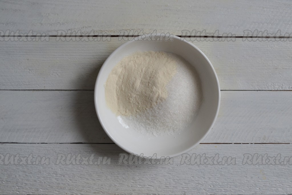 В отдельной миске соединить оставшиеся 50 грамм сахара и агар-агар. Влить 50 миллилитров горячей воды и размешать.