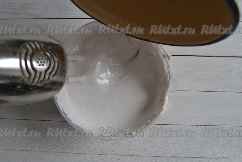 Затем очень-очень медленно, тонкой струйкой влить сахарный сироп в банановое пюре при беспрерывной работе миксера. Продолжать взбивать миксером на низкой скорости еще 5-7 минут.
