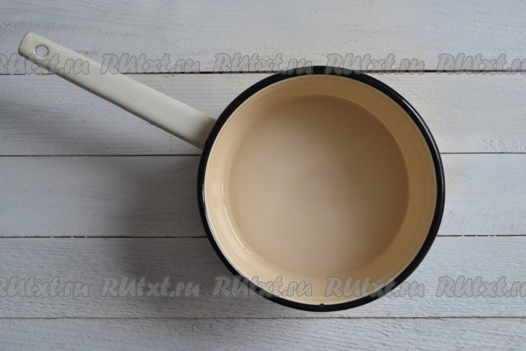 Параллельно со взбиванием пюре нужно сварить сироп. Для этого в сотейник всыпать 400 грамм сахара и влить 100 миллилитров воды.